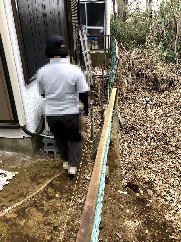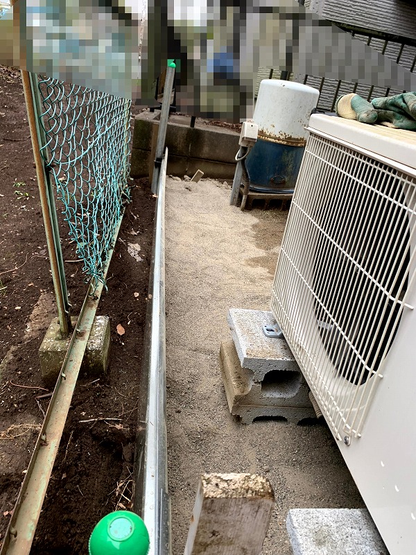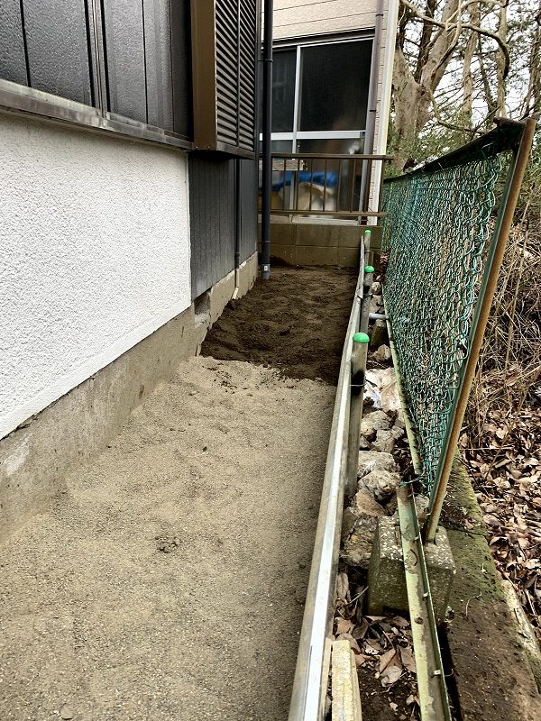 今回の通路は、家の基礎側とフェンス側で大きな高低差がありました。