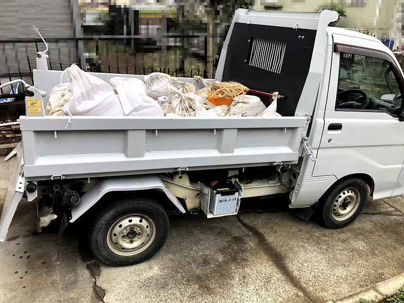 まずはスコップで軽ダンプの荷台にひたすら手積みしていきました。