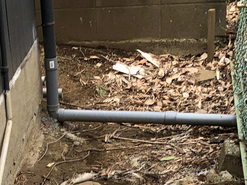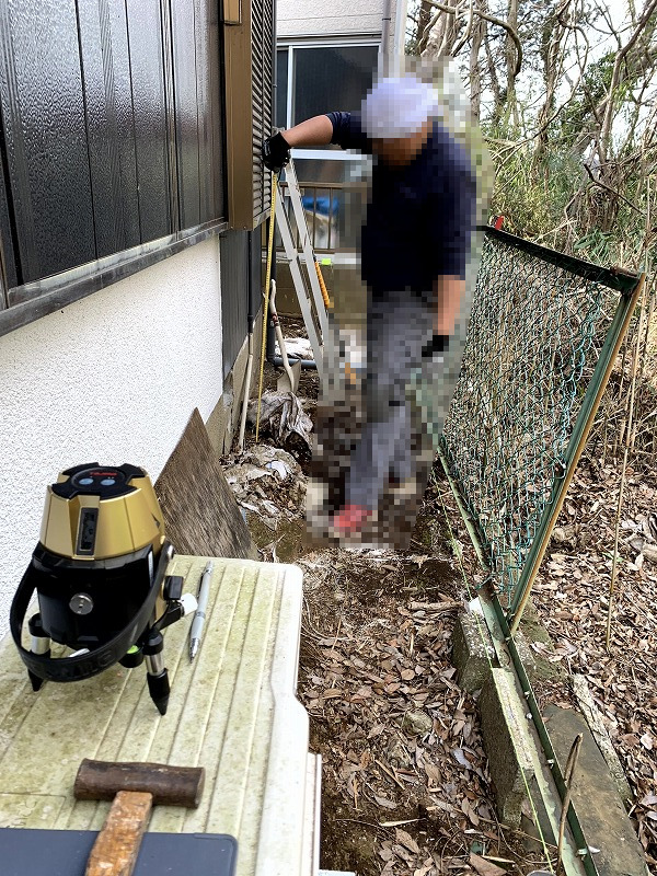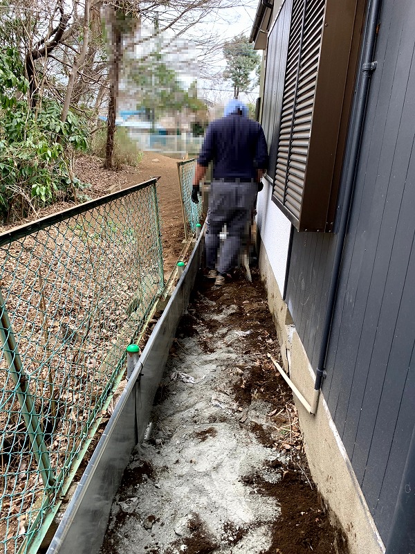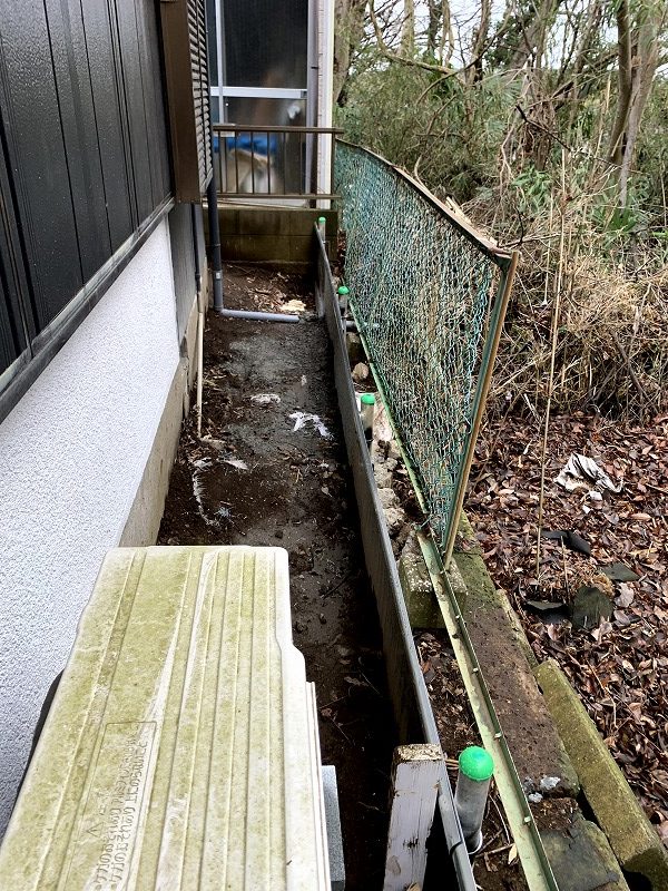 通路をぐるっと確認してみると、基礎周りの土がかなり流れ、フェンス側が大きく沈下していました。