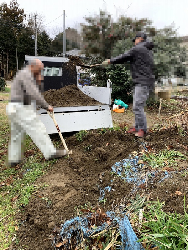 山土は「軽ダンプに手積み → 一輪車で奥へ」の流れで運搬した
