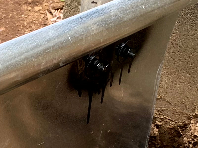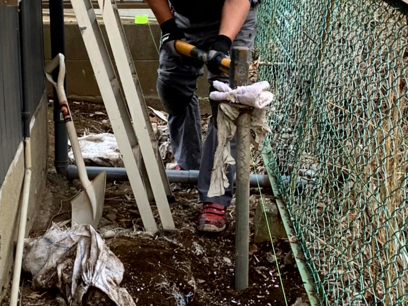次に行ったのは、土留めの柱となる単管パイプの打ち込み作業です。