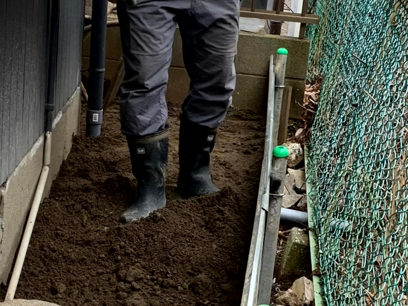 奥側の落ち込みが想像以上に大きかったため、山土を使用した