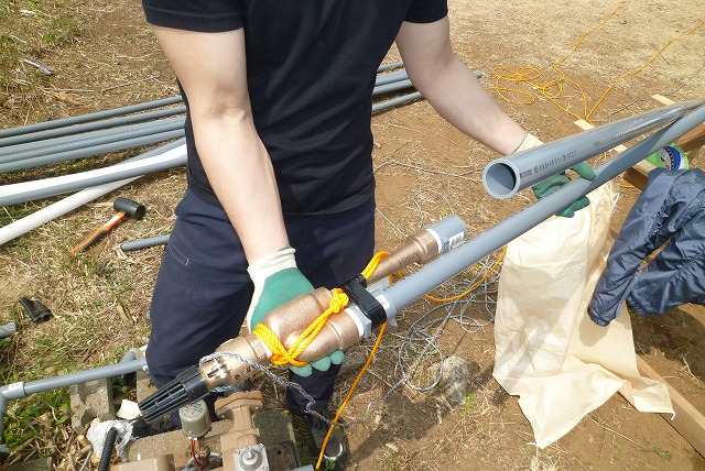 深い穴に井戸配管は、4mの塩ビパイプを繋いで20m前後の長さしかありません。