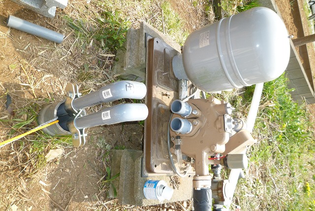 このポンプはジェットポンプ式で深井戸タイプなので、井戸穴には2本の塩ビパイプが挿入されています。