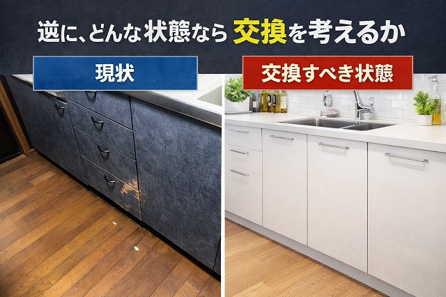 扉表面だけの劣化なら、まず補修を検討する。扉の機能不良や流し台本体の劣化まであるなら、交換を検討する。